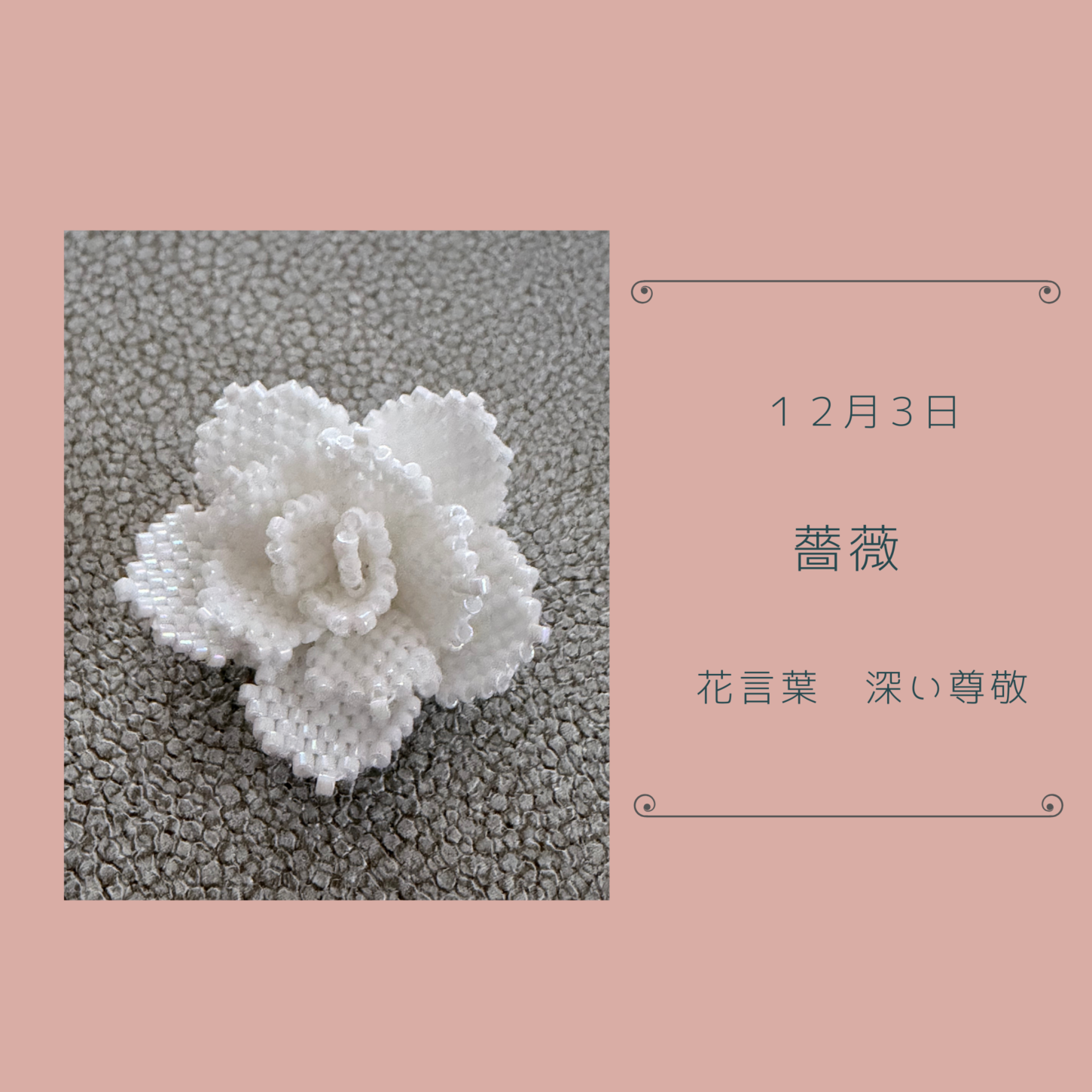 12月3日 薔薇(白) ✨ビーズで綴る花言葉365✨ 12月3日の誕生花のひとつは「薔薇」(rose)。 花言葉は「深い尊敬」です。 赤い薔薇 6月1日 こちら ピンクの薔薇 7月3日 こちら 黄色の薔薇 7月29日 こちら スプレーバラ 8月20日 こちら オレンジの薔薇 11月15日 こちら 白い薔薇 11月25日 こちら 白い薔薇 12月3日 こちら 赤い薔薇 12月11日 こちら designed by K-Okabe December ビーズで綴る花言葉365アーカイブ PREVIOUS NEXT Tweet Share Hatena Pocket feedly RSS
